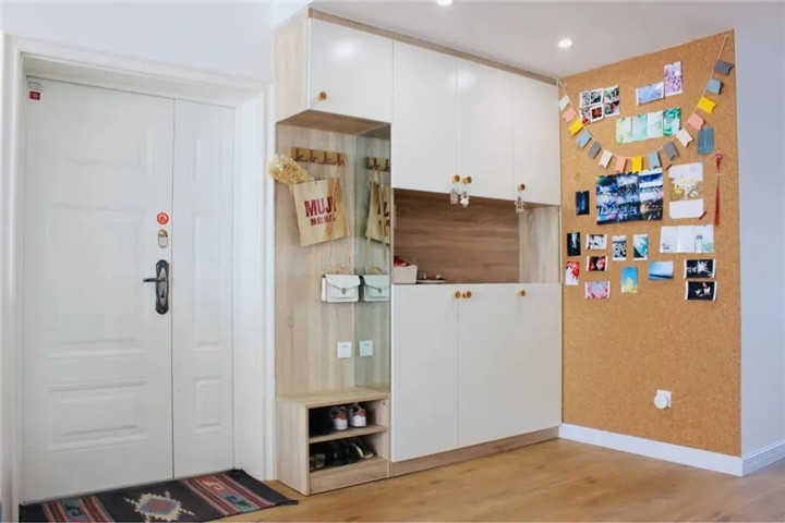 有些户型进门后在大门侧边有面与大门垂直的墙,在位置足够的情况下,装了鞋柜又不会顶住大门开门的话,那么就可以把鞋柜与大门垂直地布置,这样空间利用也是非常的实用精致。
